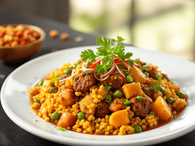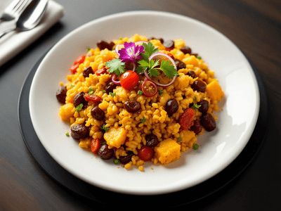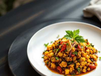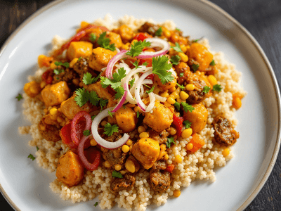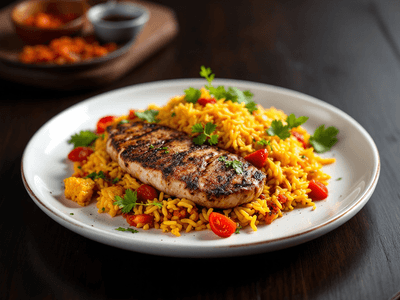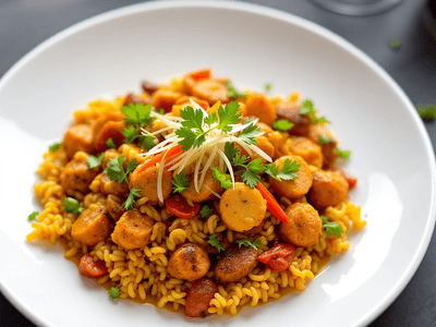 Cameroonian "director general" chicken braised with plantains and peppers.